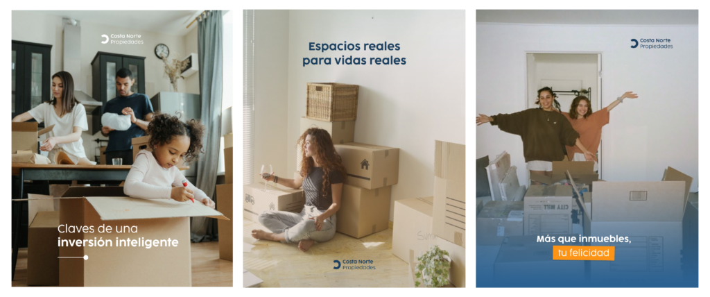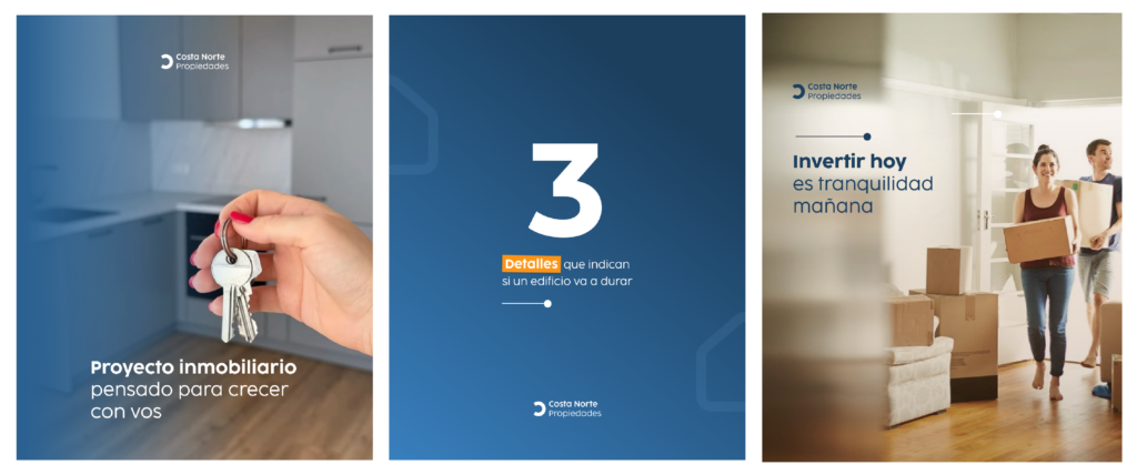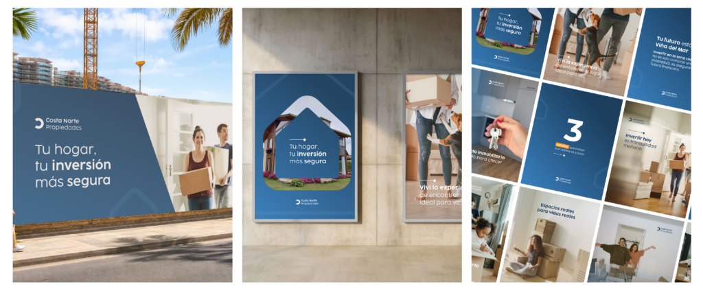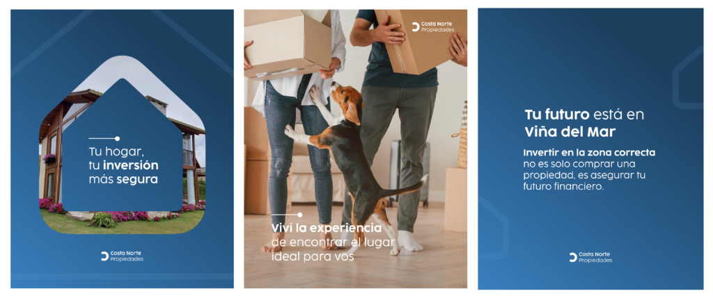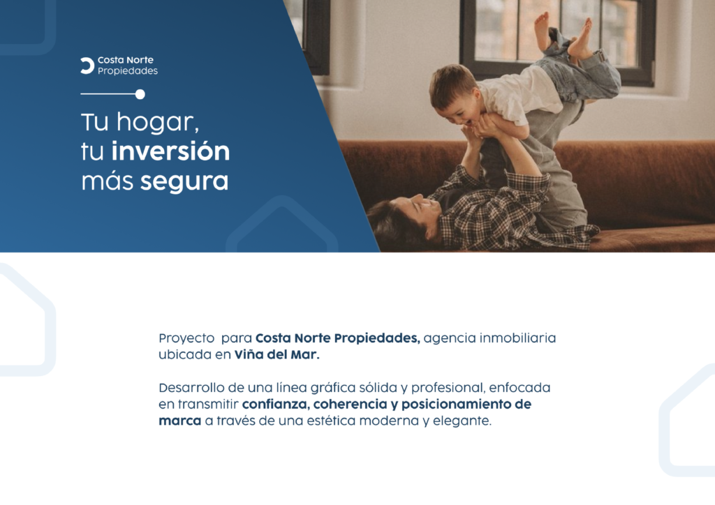 Conceptual project focused on visual identity and social media content for Costa Norte Propiedades, a real estate agency based in Viña del Mar. The proposal is built on a strong, professional graphic system, integrating the brand’s color palette into a modern and elegant aesthetic that strengthens its market positioning. The visual identity aims to convey trust, consistency, and style across all brand communications.